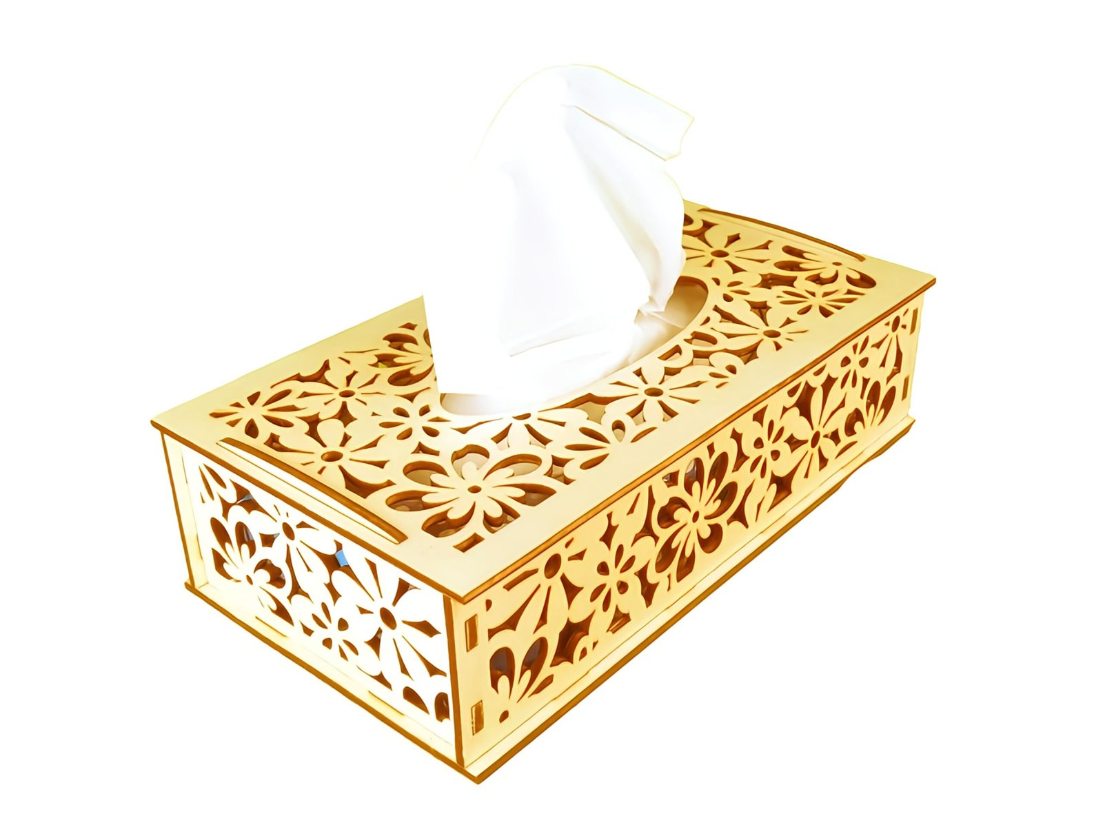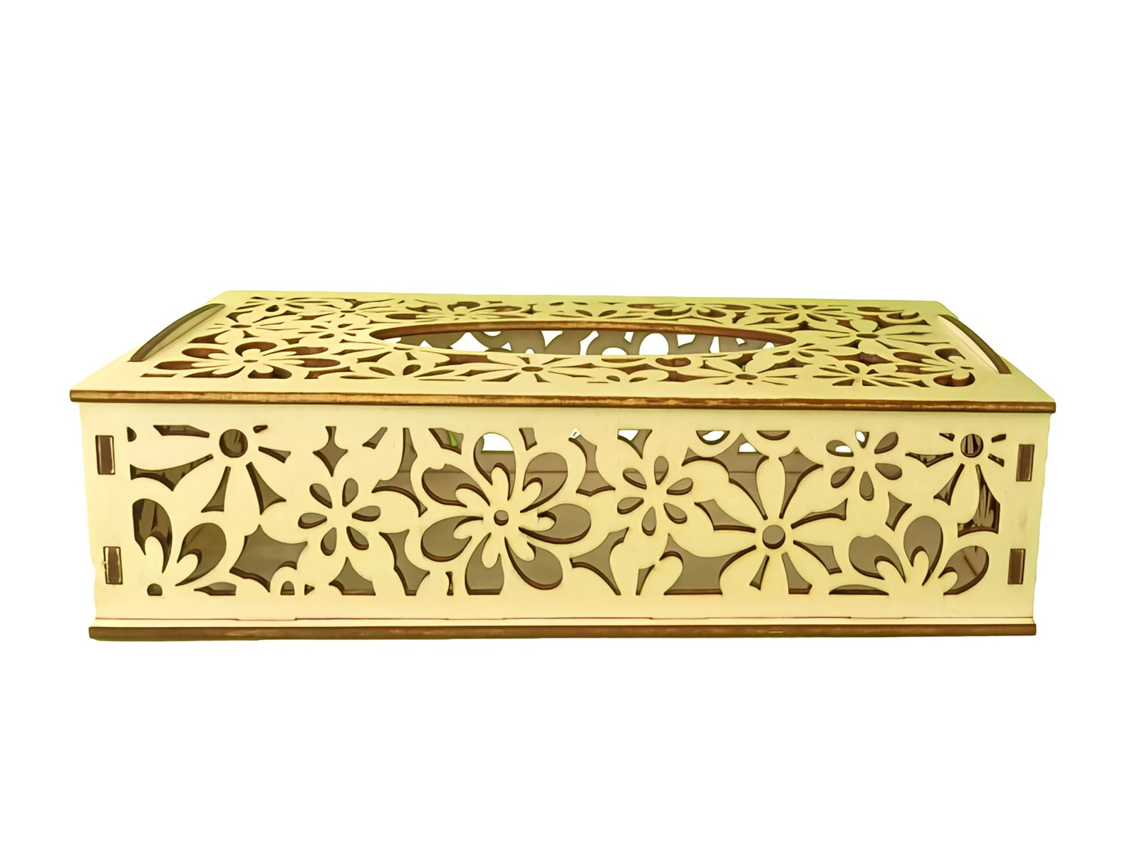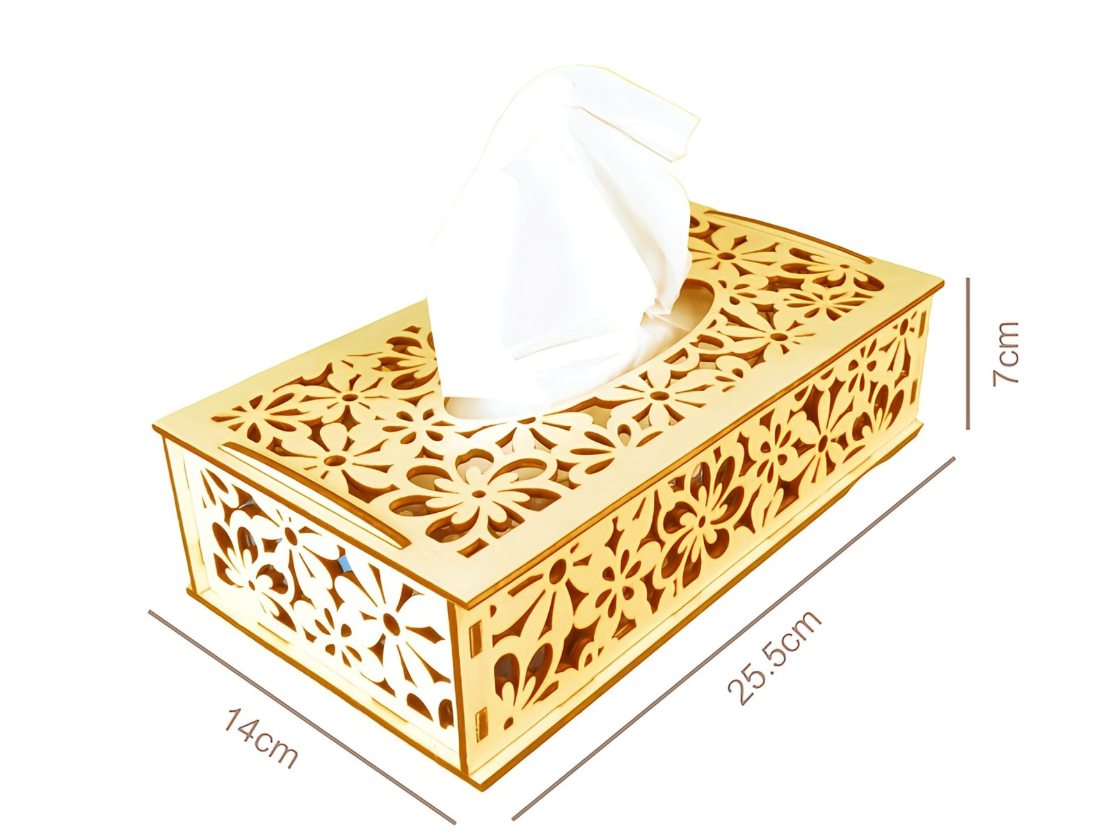 Zoek je een stijlvolle manier om tissues binnen handbereik te houden? Deze houten tissuebox met design is niet zomaar een gebruiksvoorwerp, maar een prachtig decoratiestuk voor in de badkamer of woonkamer. Omdat het bloemenpatroon met precisie is uitgesneden, ontstaat er een uniek schaduwspel op het hout.